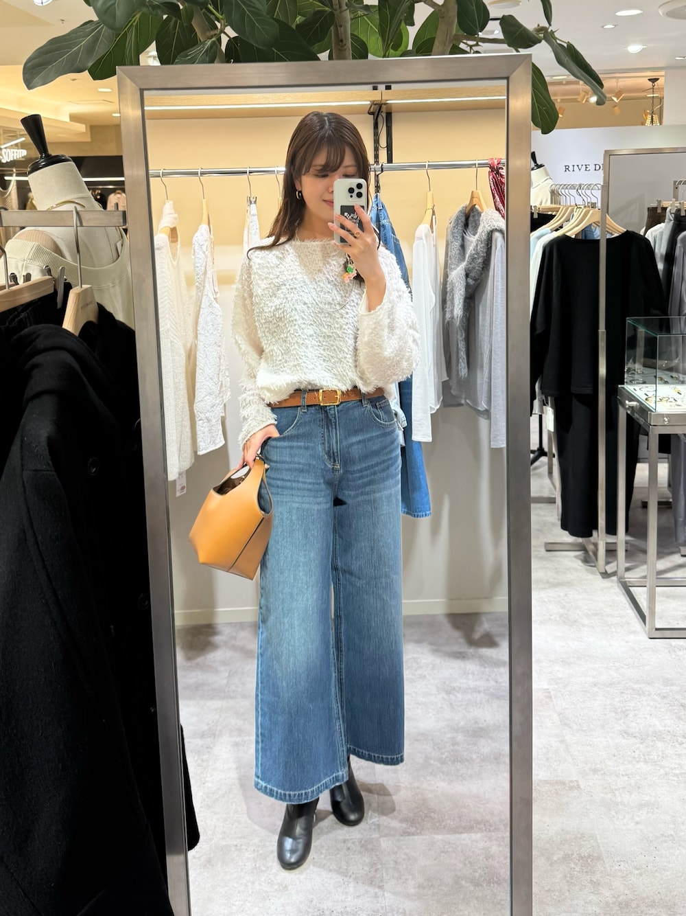 【ブラウス】 一目惚れの方も多いジャガードブラウス 1枚で華やかにみせてくれるデザインと、オンオフ兼用使いもおすすめなので、着回し力も抜群です 【パンツ】 38サイズ 脚長効果の高いデニムパンツ 程よくフレアのデザインなので女性らしい印象に。