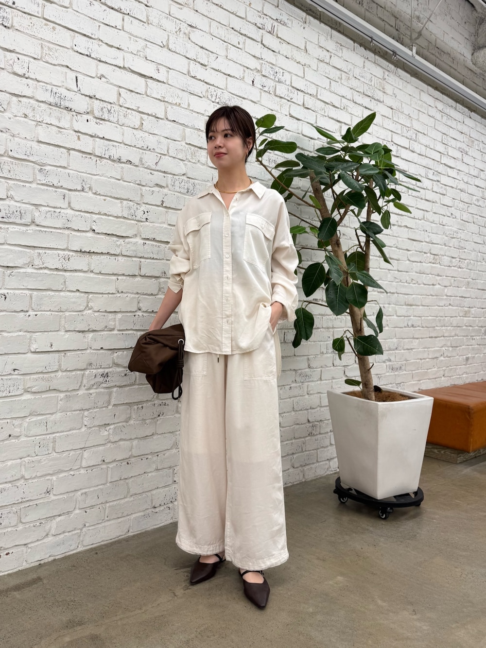 【トップス】 とろみのある生地で着心地もいいガーメントシャツ ストンと落ちるシルエットなので、ボリューム感もなくスタイリッシュな雰囲気に 【パンツ】 38サイズ ウエストゴムのデザインで腰回りのラインを拾いにくいのでスタイルアップして見えます