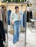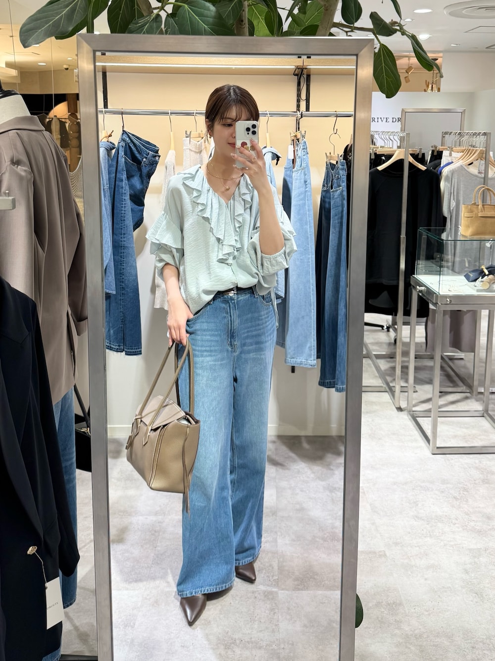 【ブラウス】 フリルデザインで1枚で華やぐブラウス vネックで顔まわりもすっきり見えします 【デニム】 38サイズ 美脚見えのワイドデニム 脚長効果抜群です