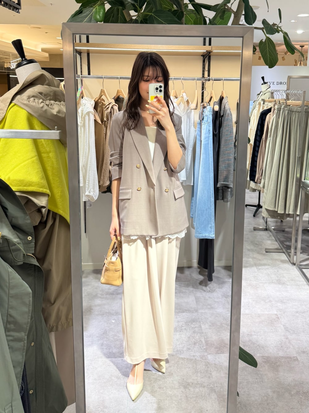 【ジャケット】 シワにもならず、着心地も抜群のジャケット ゴールドのボタンで華やか見えします。 【キャミソール】 合わせるだけで決まるレースキャミ 肩紐も調節していただけます 【パンツ】38サイズ ウエストゴムで楽々穿けるワイドパンツ 接触冷感なので穿き心地も心地よいデザインです