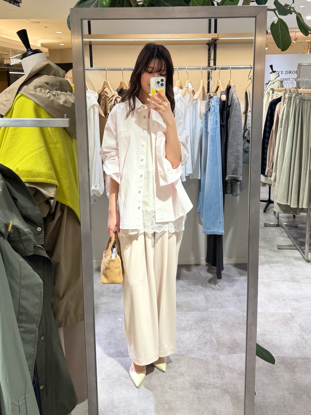 【シャツ】 長めのシルエットと落ち感が綺麗なシャツ 甘くならず大人っぽい印象に 【キャミソール】 合わせるだけで決まるレースキャミ 肩紐も調節していただけます 【パンツ】38サイズ ウエストゴムで楽々穿けるワイドパンツ 接触冷感なので穿き心地も心地よいデザインです