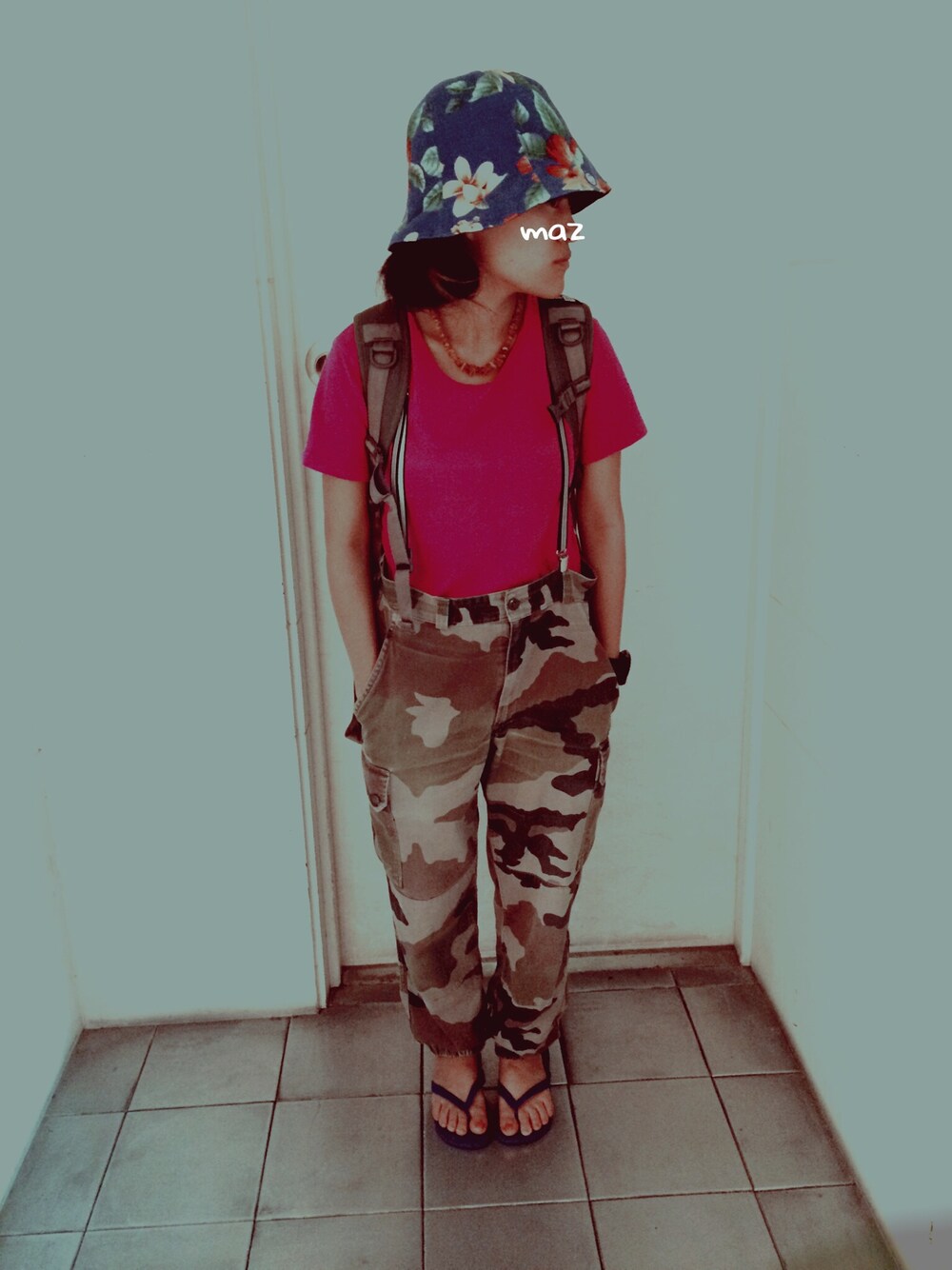 怒涛の制作大会です 一応夏休みなんだけど、なぜか毎日学校です 絶賛夏バテ女子やってる、、 Tshirt / used bottom / used sandals / havaianas hat / CA4LA necklace / おみやげ back pack / NEWERA suspenders / BIG TIME 久しぶりにこのずぼんはいたー すごいおっきいから サスペンダーかベルト必須です 最近はサイズ感あってるのが好きなんだけど あきらかにオーバーサイズをはいて サスペンダーでつるのもやっぱりすき。 柄×柄も大好き。 花柄×迷彩 ♡