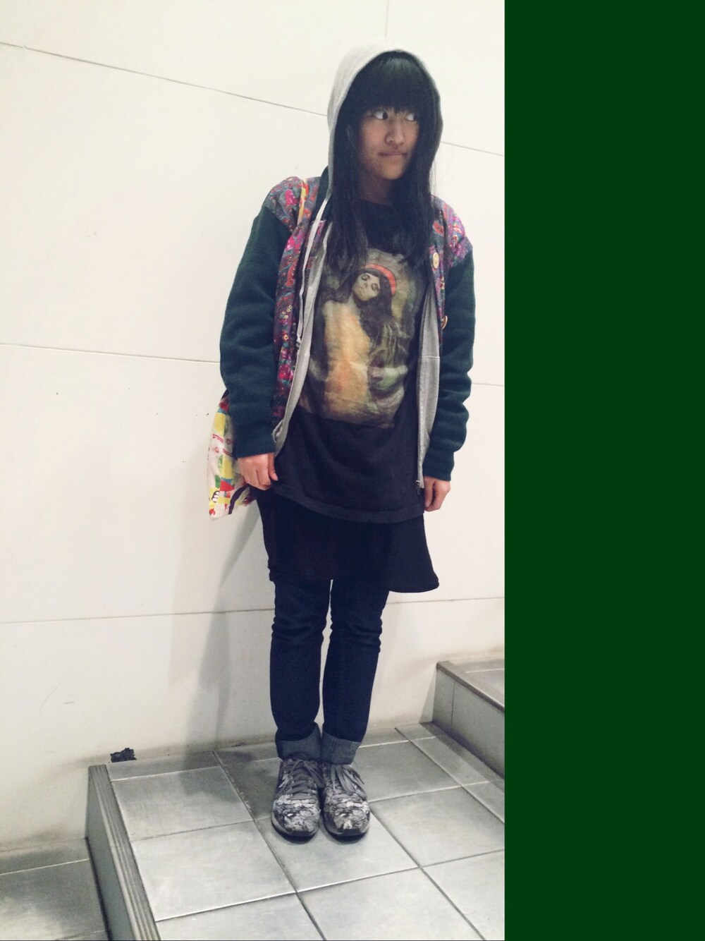 今年はじめてのピックアップタグコーデ アウター×グレーのパーカー 古着はしょっちゅう着てるんだけど久しぶりに古着感だしたスタイル。 パーカーはむかしのUNIQLOせんせいをお友達からおさがり。 UNIQLOのパーカーはこの頃が一番可愛かったなあ 今のも好きなんだけどこの頃は裏側のパイピングを違う色にしていて地味おしゃれなデザインだったなあ 昨日はあったかかったので久しぶりにコートなしでした! おかんからおさがりでもらったバブル時代のゴルフウエア。 サイケな花柄の首回りのリブが好きなデザイン。 着膨れしなくて薄くみえるけど裏地があつくてあったか服。 インナーは大好きな画家ムンクの代表作マドンナの絵のプリントT。 ノルウェーにいったときムンク美術館で買ったやつです。 美術館で売ってるTシャツとか海外のお土産Tシャツとかがとってもすき。 中に黒無地のTワンピかさねてちょっとだけみせて下がデニム、この組み合わせがすき。 男の子とかがロング丈のTシャツきてスキニーはくスタイルがすきでいいなあと思いつつも 雰囲気的にやっぱり男の子がやってるほうが可愛くてずるいなあっておもう 女の子は何着てもどんなテイストでもそれなりにはまってしまうけど 男の子は男っぽいっていう概念がいまでものこってるぶん アイテムやテイストによっていい意味の違和感が生まれてそういうのって女の子じゃ絶対できないからそんな雰囲気の男の子に憧れます。