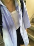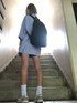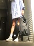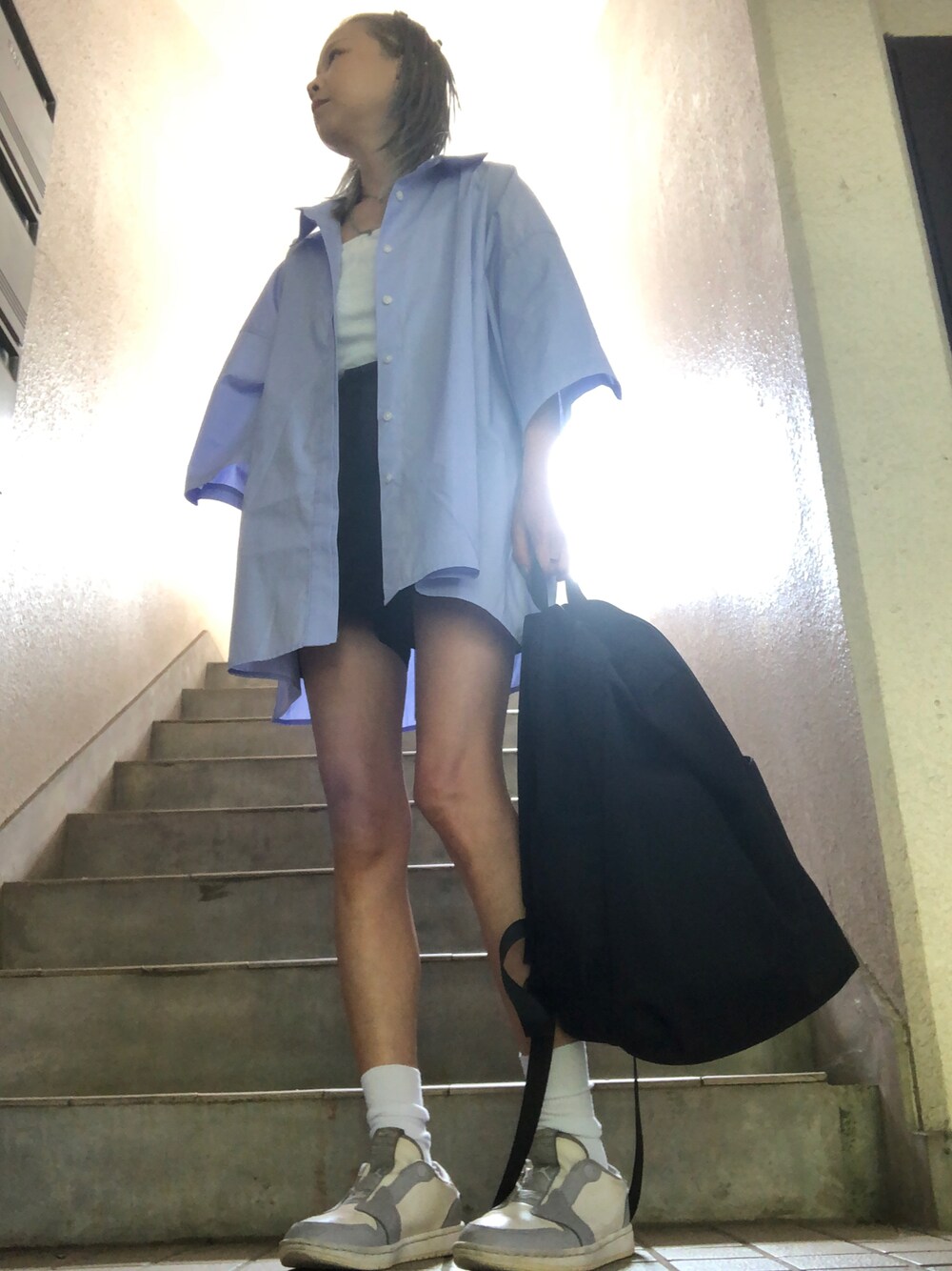 💙青味パーポーのシャツ👔はゆるっとサイズ感だったから締めてきた方が可愛いと気づいて途中で出先で締めた件💙笑 y/mのリュック軽可愛でお気に入り🖤