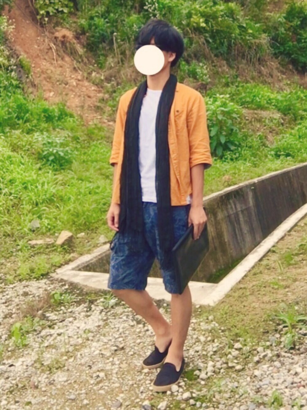 リネン素材のシャツとハーフパンツを着ました〜 夏を感じてます!🌴 黒のストールは重宝しそうです✨ では👋