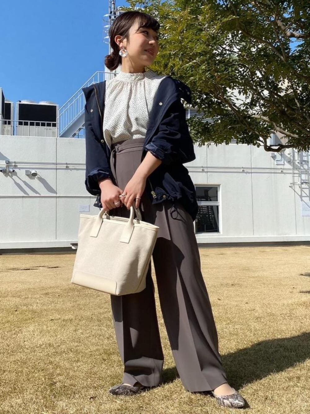 身長149cm 着用サイズ アウター、ボトム (36サイズ) ブラウス(freeサイズ) カジュアルになりがちなブルゾンにブラウスをあわせキレイめなスタイリングにしました。シンプルな配色なのでブラウスには明るいカラーを、シューズにパイソン柄を差し込みました!