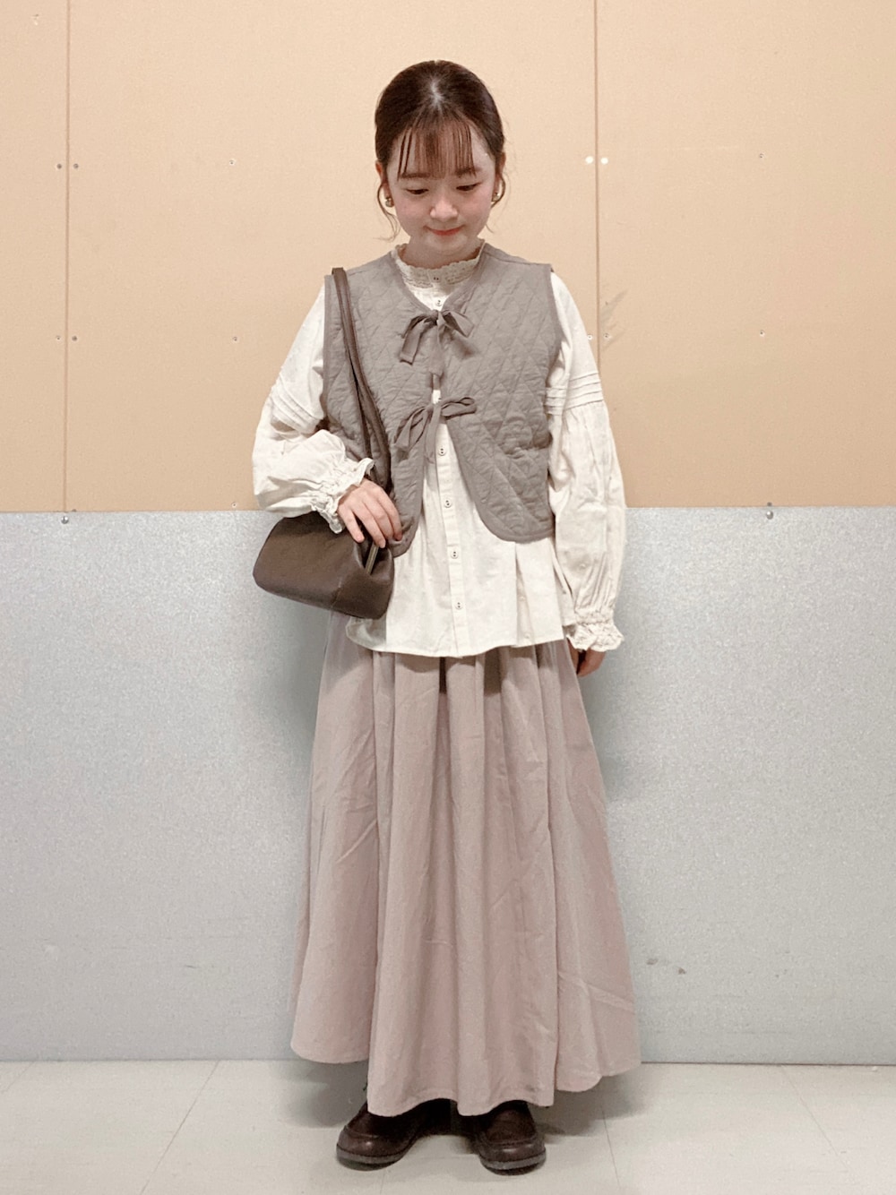 大好きな淡色ワントーンコーデ𓂃 𓈒𓏸 全体的に色味をまとめてナチュラルに。 キルトのベストは短めの丈感でコーデのアクセントになります!着回し力も◎