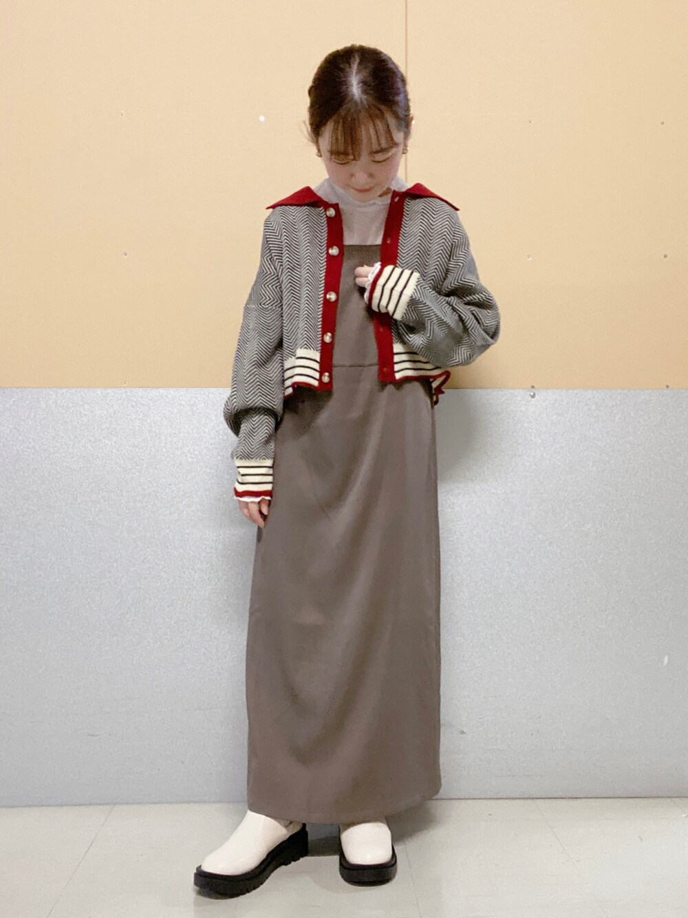 ゆーのカーディガン/ボレロ「ヘリンボーンカーディガン」を使ったコーディネート