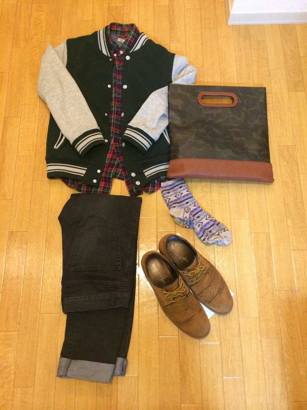 緑色ベースのコーディネートです! パンツは細身のもの、クラッチバッグは迷彩柄で(^^)