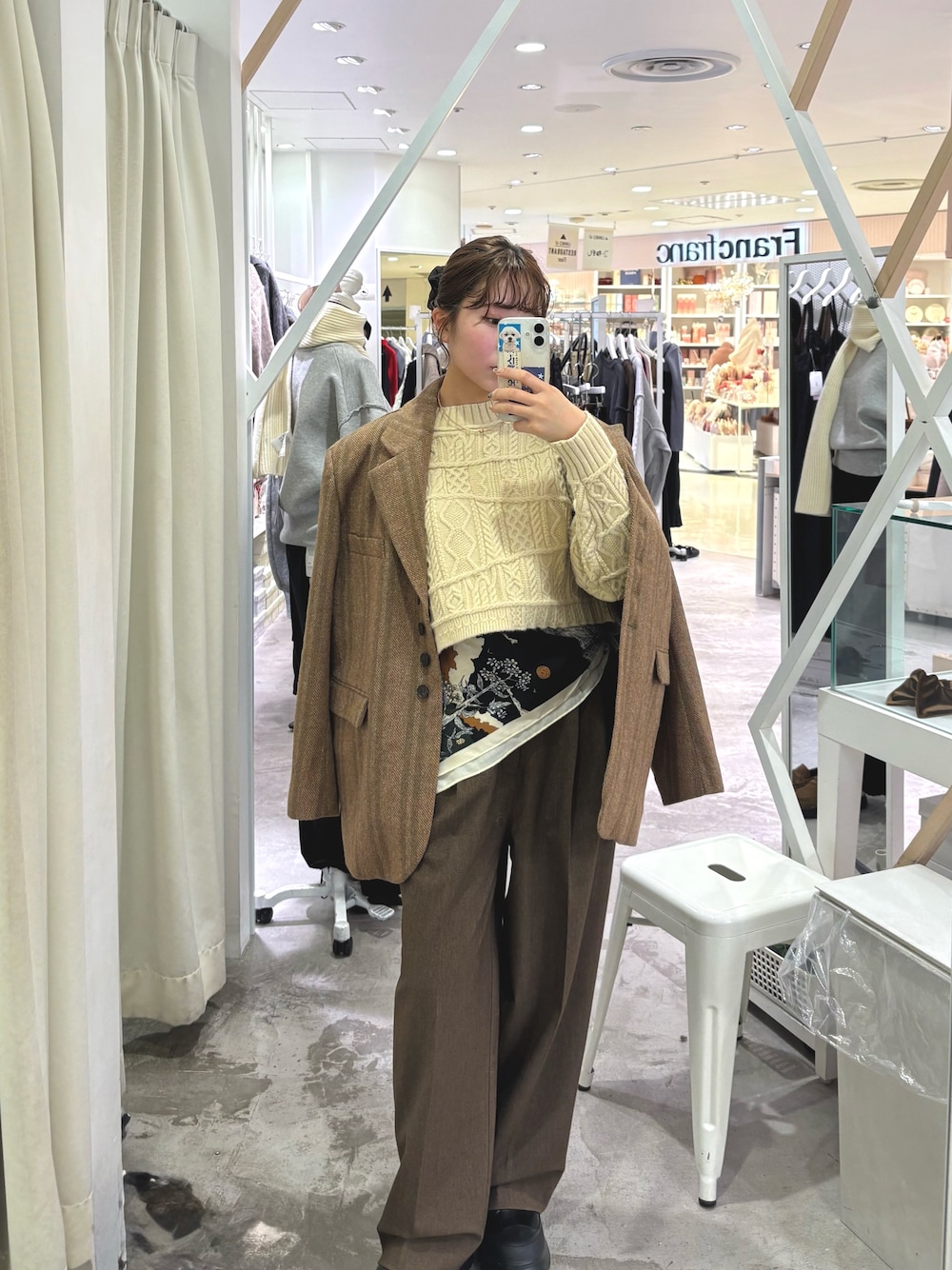 ケーブルニットは短めの丈感なので、中に長めのシャツを着込んだり、スカート合わせなど、様々な洋服と組み合わせ可能です🙆♀️ 是非店頭でお試しください!
