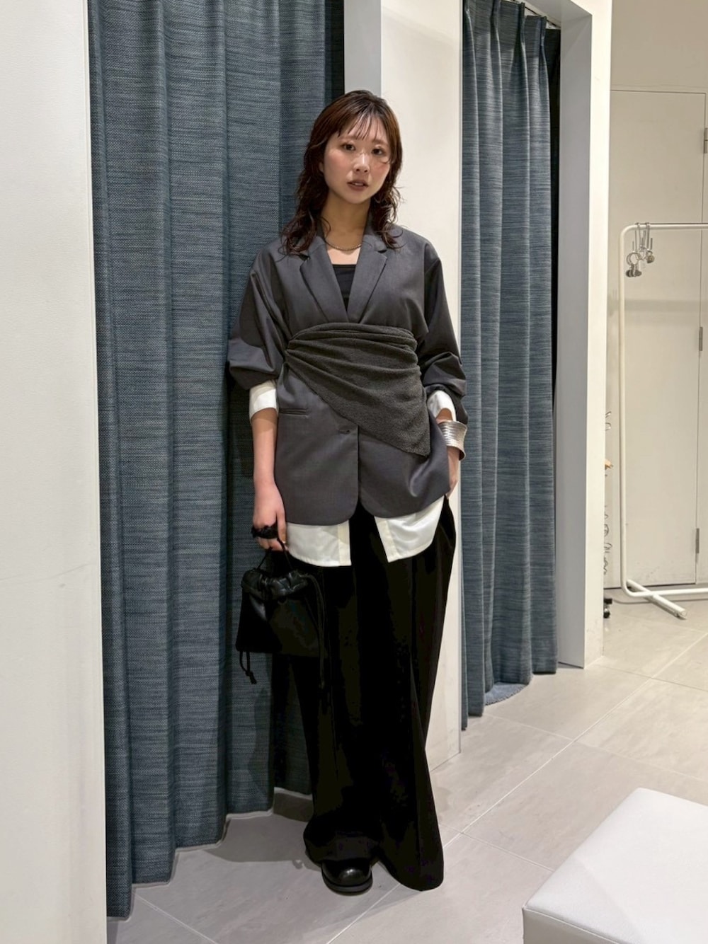 オーバーサイズのジャケットはスカーフなどでウエストマークするとスッキリ着れます✨