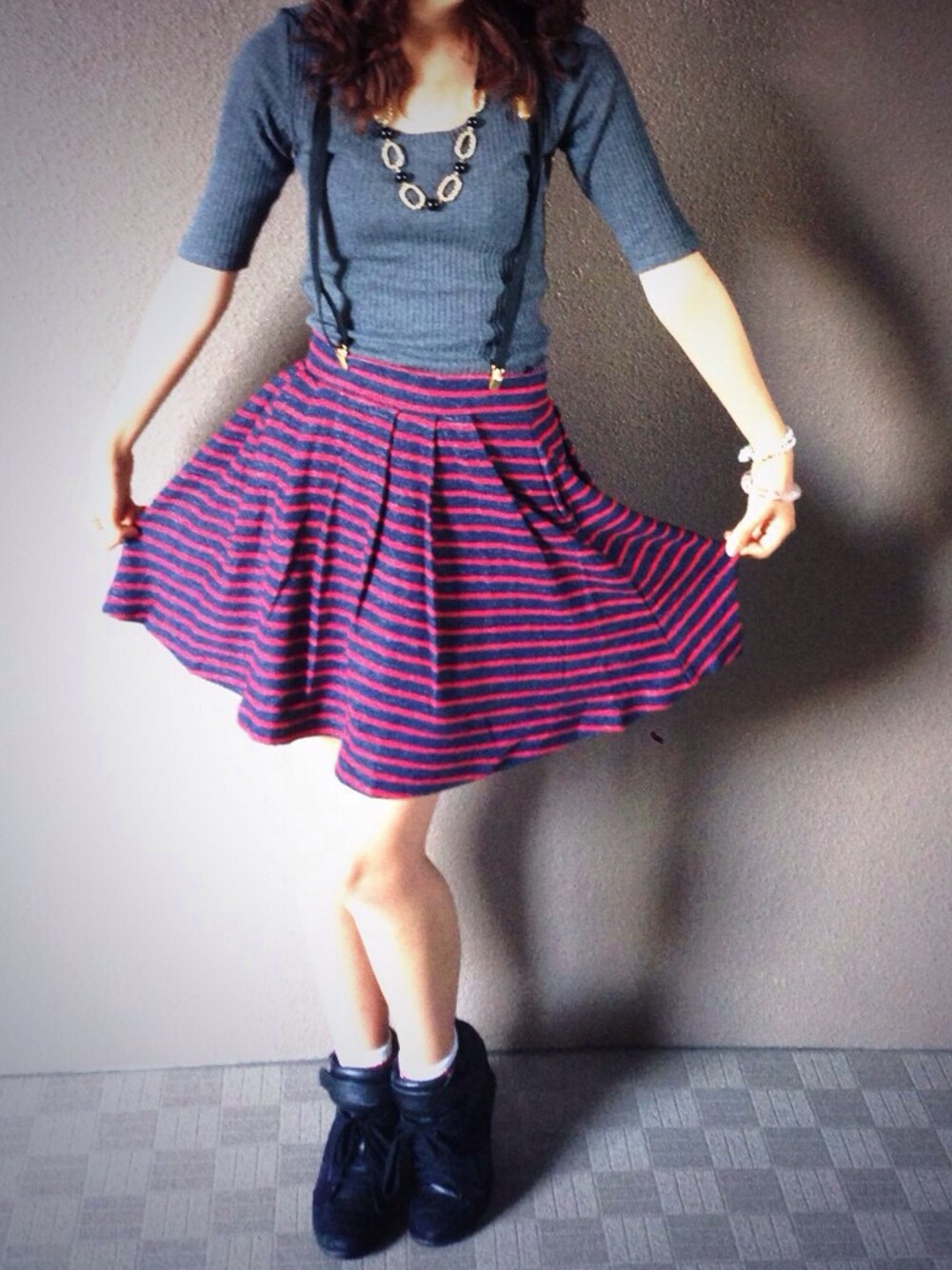 本日のGUコーデ。 グレーのトップスに RedxNavyのパイル生地スカートで秋色コーデ。 ネックレスとサスペンダーは BlackxGold!