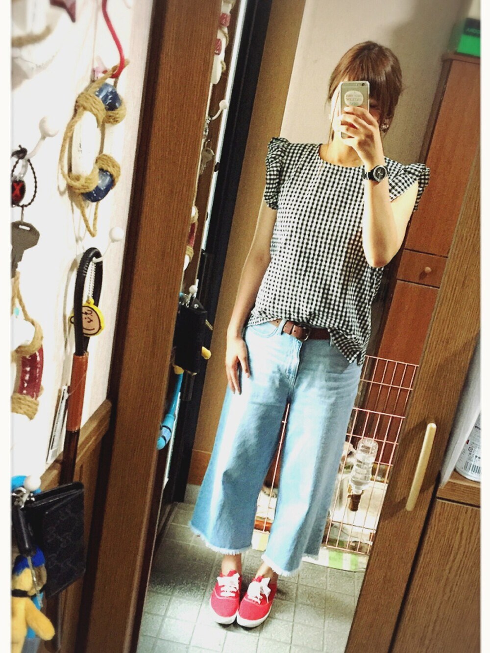 いつも、いいね!sevaしていただき ありがとうございます♡ 毎日暑いので〜 わかってはいるが〜 太い腕さらけ出してますw笑 ごめんなさーい🙇 チェックノースリーブ♡ 切りっぱなしデニム♡ ワイドパンツ♡
