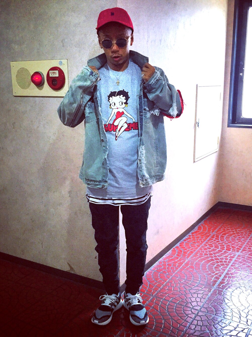差し色を3つ赤を入れました 腕章 cap tシャツロゴ