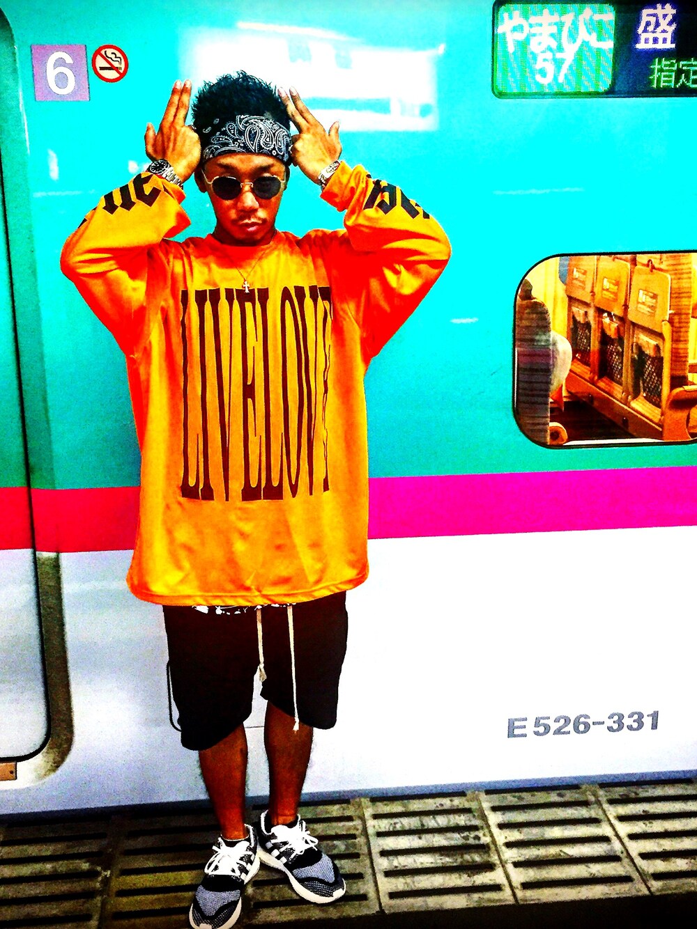 ホワイト系のスニーカー、オレンジ系のTシャツ/カットソーを着用したメンズの夏コーディネートの1枚目の写真