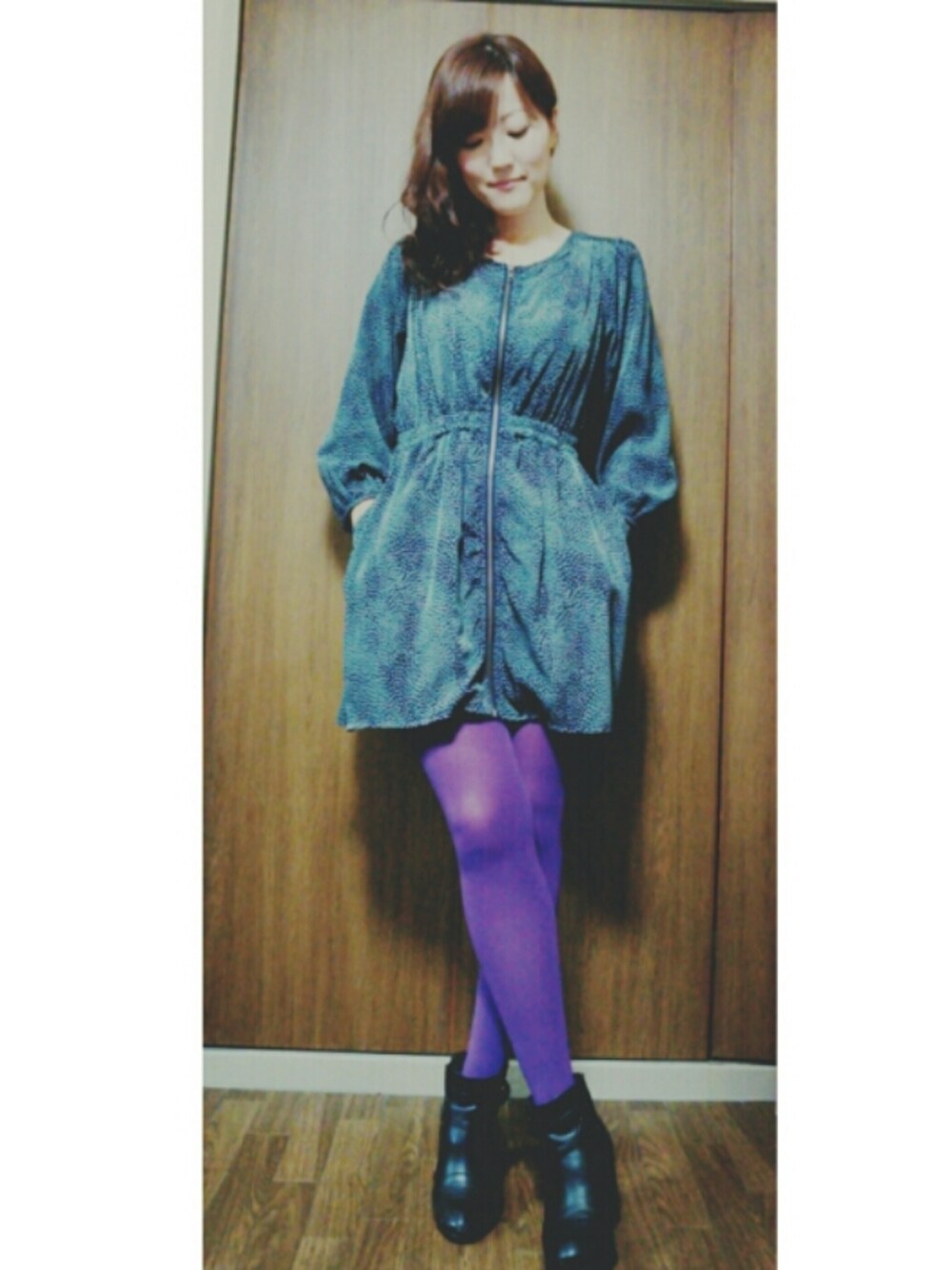 気にしない! カラータイツって、女子受けはいいけど男性受けはイマイチなんですよね~(汗) でも、そんなの気にしないもーん( ̄0 ̄) ワンピース→apart by lowrys ブーツ→forever21