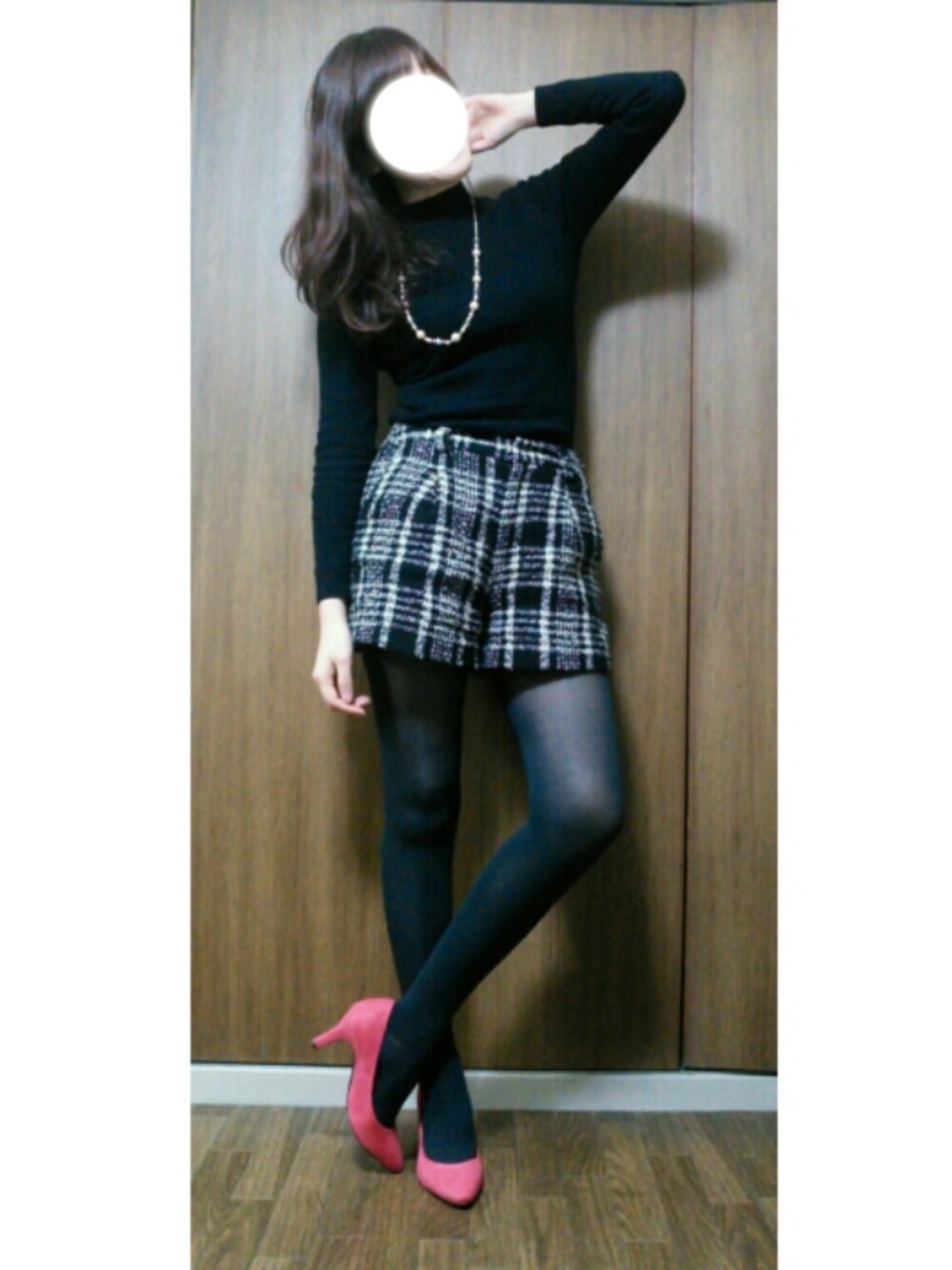 紅一点! 赤パンプスを際立たせるために、その他は全部黒で♥ ニット→Heather ショートパンツ→ViS パンプス→ViS