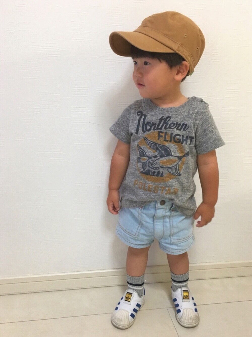 三男コーデ♪ 2歳2ヶ月 グレーTシャツ × デニム短パン × adidas このデニム短パン、商店街のお祭りで、 激安でGETしたもの‼︎ このステッチと色味とレトロ感たっぷりなのが、 可愛すぎる((≧艸≦*))♡ 今年はちょーどイイsize感になってて ほんま可愛すぎるゎ♡ インスタでハンドメイドピアスも販売中です◡̈♥︎ 良かったら覗いて下さいね♪