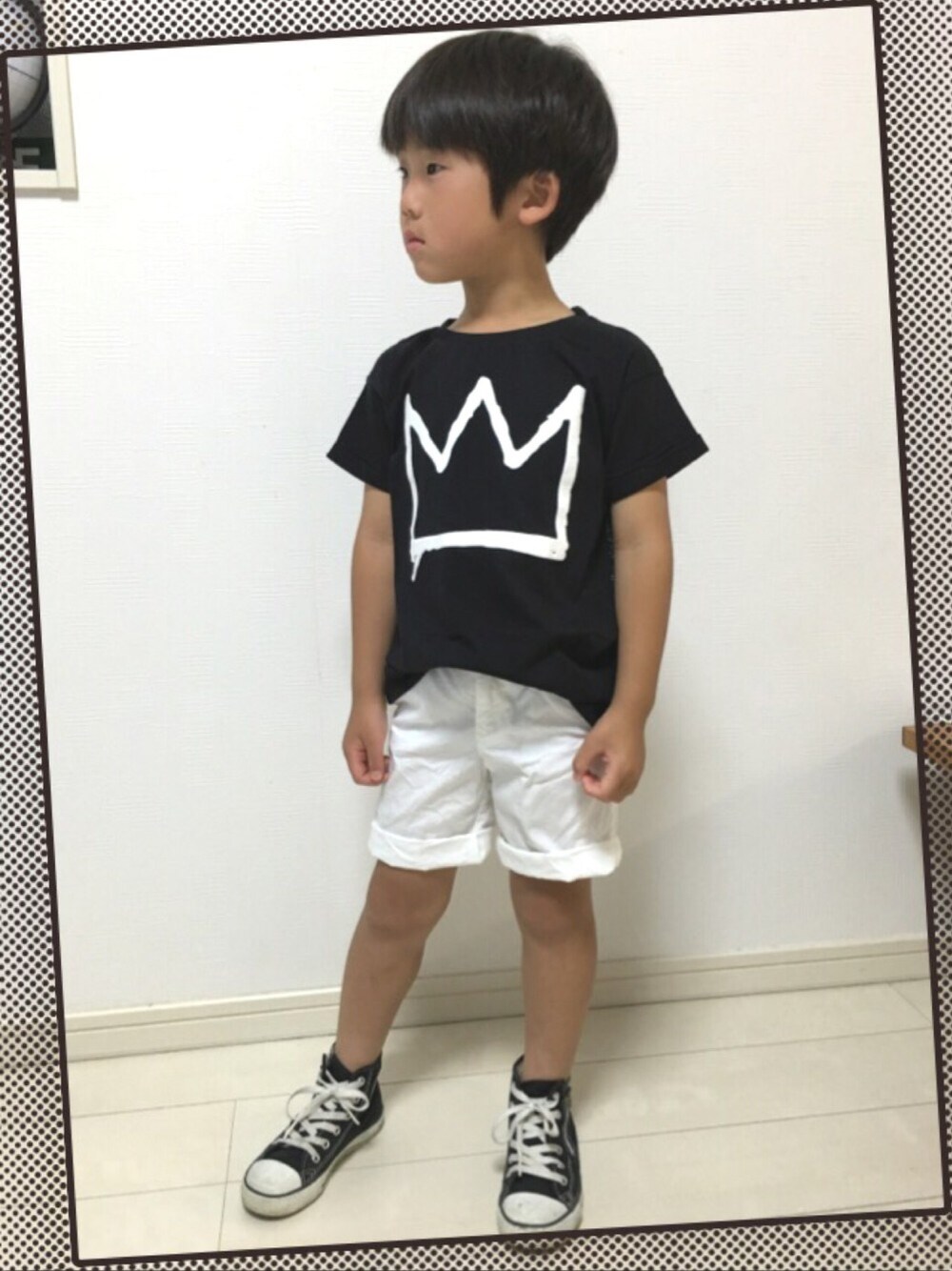 長男コーデ♪ 黒Tシャツ × 白短パン × 黒コンバース しょわーずオセロコーデフェスに 参加させて頂きます(*^^*) モノトーン大好きなんです♡ 主催者様よろしくお願いします♪ COMECHATTO&CLOSETのTシャツ バックプリントもオシャレです♡ 白黒大好きシンプルコーデで ドラフトCOにも参加します♡ よろしくお願いします♪