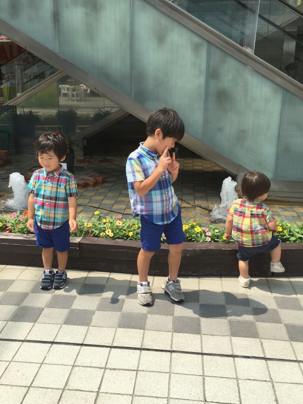 三兄弟コーデ♪ チェックシャツ × 青短パン × スニーカー ラルフのチェックシャツでリンクコーデ♡
