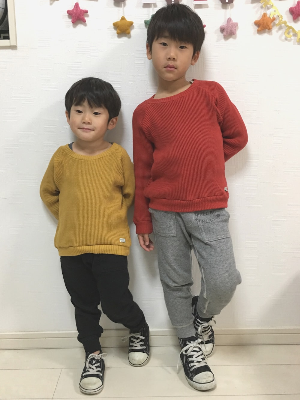 兄弟コーデ♪ 長男&次男 スウェットトップス × スウェットパンツ 色違いのお揃いコーデです(*^^*)♡ 小窓→三男も靴持って来て一緒に並ぶけど、 じっとしないから長男に捕まえてもらった(๑˃̵ᴗ˂̵)