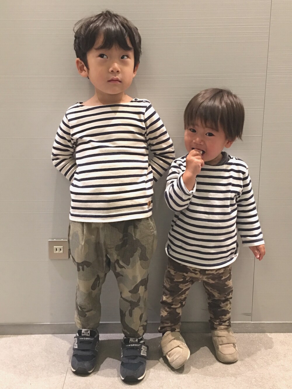 兄弟コーデ♪ 次男&三男 ボーダーカットソー × カモフラパンツ 兄弟リンクコーデです(*^^*)♡ 長男もボーダーとカーキで三兄弟リンク♡