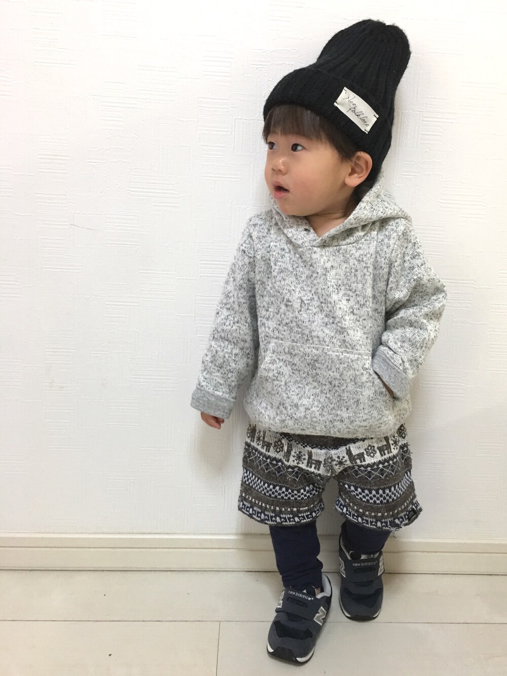 三男コーデ♪ 1歳9ヵ月 79.5㎝ / 10.6㎏ パーカー × ニットショートパンツ&レギパン 新入りニューバランス◡̈✴︎ 最近やっと外に行く時は、靴を履くって事が 分かるようになりましたꉂ(˃̤▿˂̤*ૢ)'` 今までは裸足で飛び出してましたw ニューバランスはマジックテープが大きく、 履き口も大きいから脱ぎ履ぎさせやすく お気に入りです(*^^*)♡ 先日、自分で履いててビックリ! すご〜い‼︎上手♡って褒めたら ドヤ顔してました( *^艸^)w 小窓→ベビーカー乗車中、上から顔出してきて、 買い物袋に手を伸ばしてあさってました(^^;;