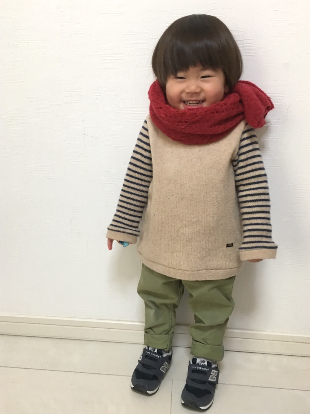 三男コーデ♪ 1歳10カ月 ベージュニット × カーキパンツ 腕のボーダーが可愛いニット♡ お下がりだからまだ少し大きいけど 可愛いからお気に入り(*^^*)♡ 今日はバレンタインデーだから 赤マフラーも巻いてみた( *^艸^)♡ 長男は、幼稚園のガールズ達に たくさんチョコもらってイキってましたw 次男もオマケでもらって喜んでました♡ 小窓はハンドメイドピアスです♡ Instagramで販売中です◡̈♥︎ 全長5㎝の大ぶりで、 パステルカラーとパールが春らしいピアスと なっています♡