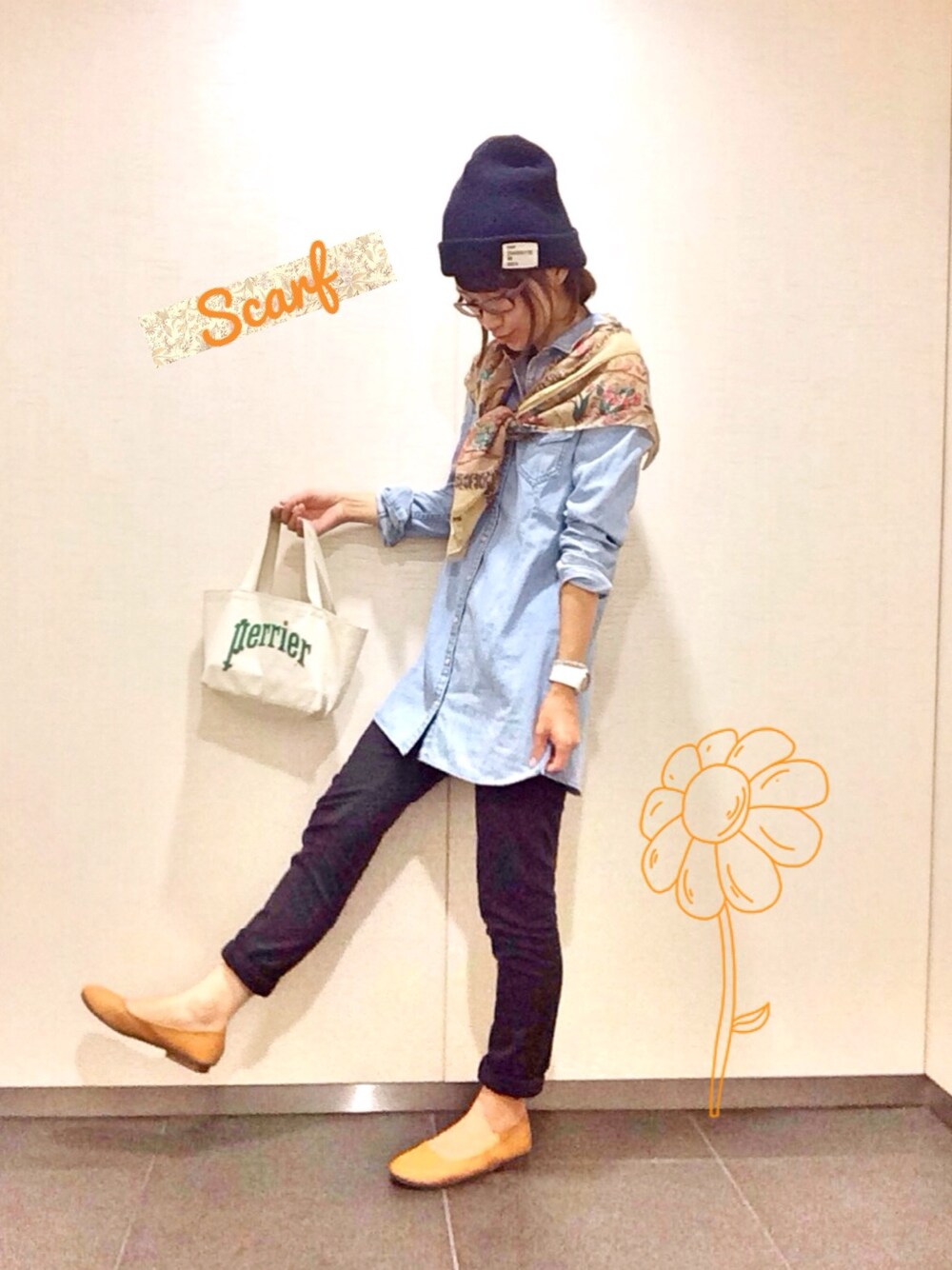 カバンは前働いてたカフェでゲットしたもの。 めっちゃペリエ(笑) ニコのストールを小さくたたんでスカーフに◡̈⃝♩