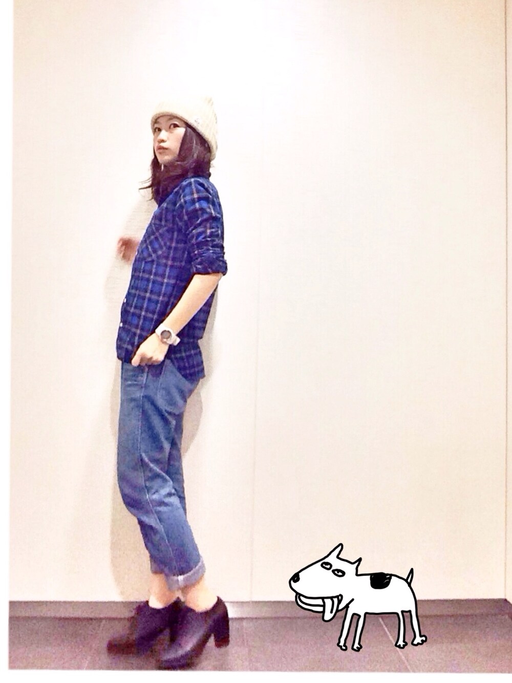 チェックシャツを買いすぎて 全然着れていない(´Д` ) 青チェックも活躍させたいなー( ˘ ³˘)♡ 手がブレてる(´・ω・`)