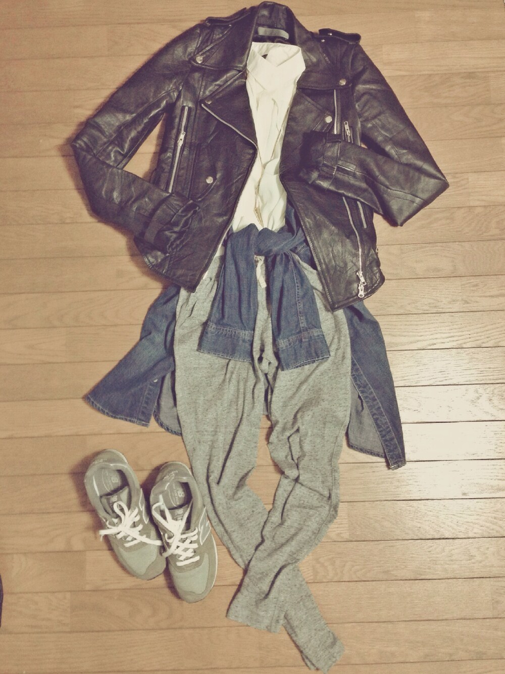 レザージャケット/ekam シャツ/mango デニムシャツ/ungrid スウェットパンツ/uniqlo シューズ/h&m