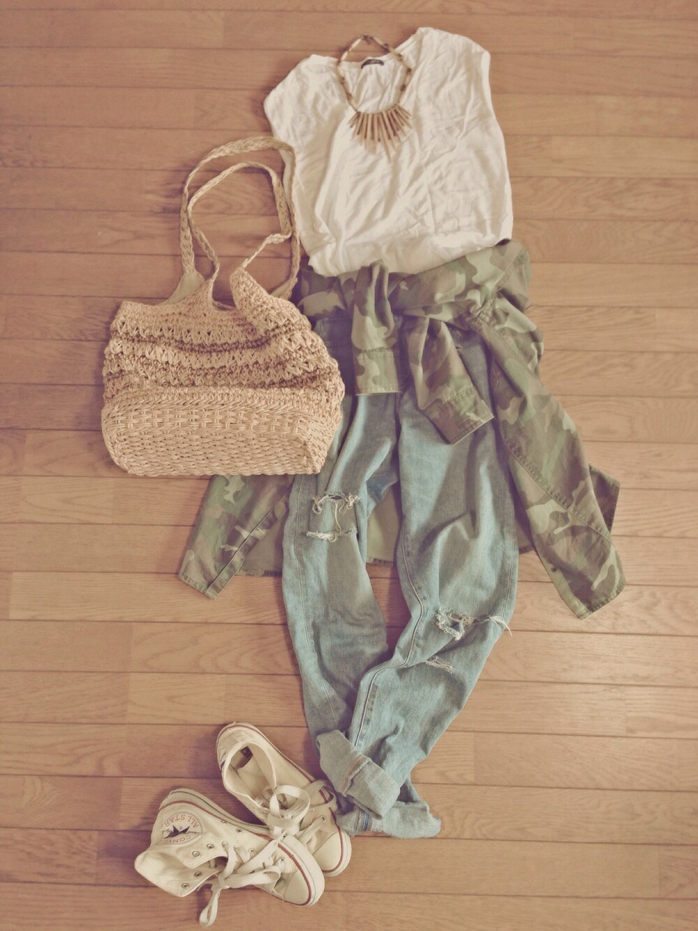 迷彩ジャケット/zara 白Tシャツ/ デニム/ungrid スニーカー/converse バッグ/hawaiiで買ったもの