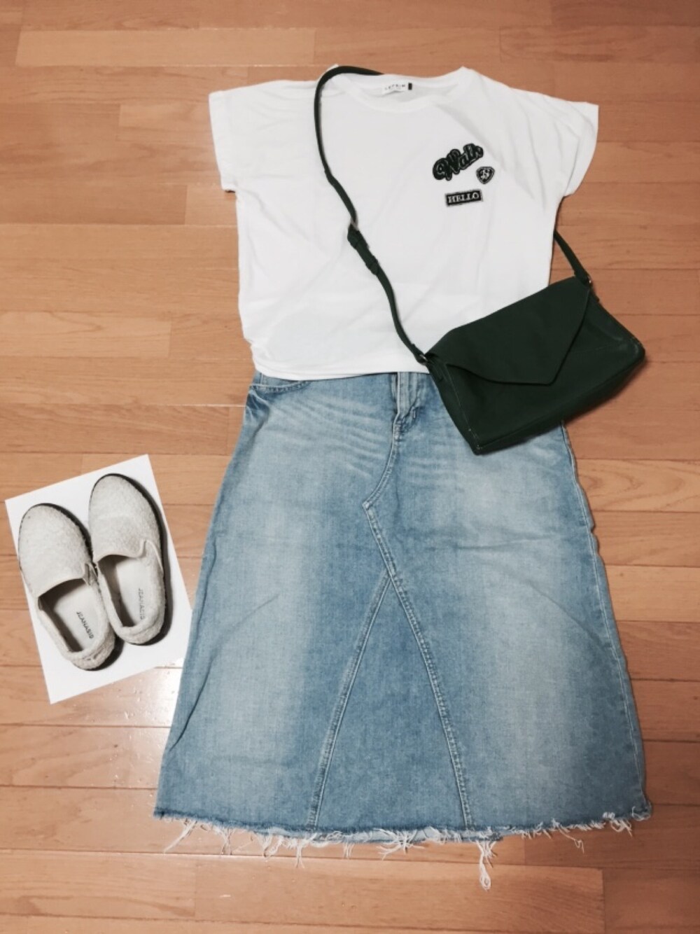 このトップスはさわり心地がとっても良くて、左胸にあるさりげないポイントがとってもお気に入り〜☆☆☆ デニムのスカートもちょうどいい丈感で、好きなスカートの一つです★彡