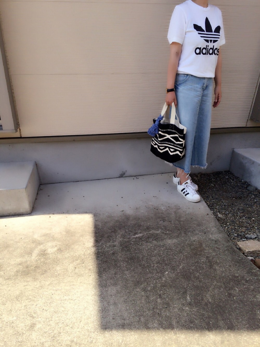 今日もジメジメどんより〜の日🌀 今日は雨降りでいつもの愛車、チャリ🚲に乗れないのでそんな時こそいつもはあんまりはけないスカートを(*^_^*) このデニムスカート大好きです♡ そして〜Love❣️adidas🎵