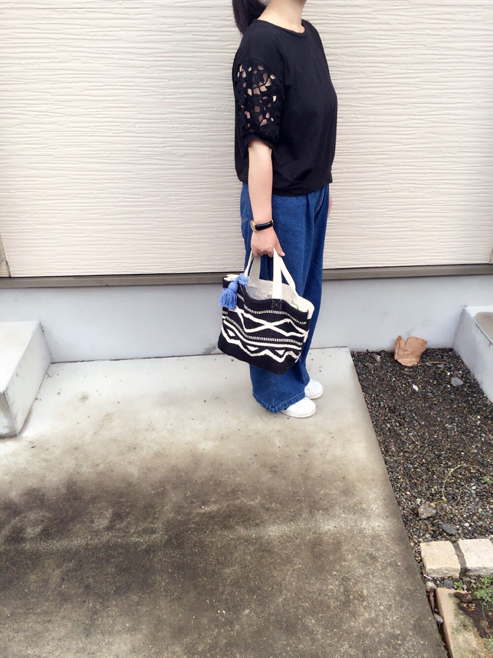 いや〜、暑いですね〜〜^_^; このトップスは袖の部分がレースで涼しいし、何より可愛いくて気に入ってます☆ デニムパンツもワイドシルエットなのにスッキリ見えするから大好き〜〜♡