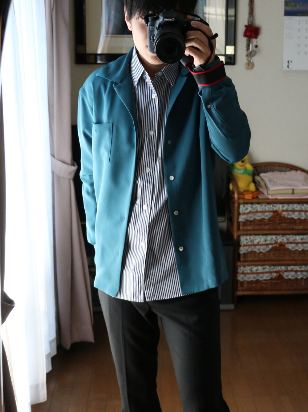 グリーンオープンカラーに ストライプのシャツを合わせて見ました。 パンツはアダムのスラックスで 適度にアンクルが見える程度です。 <size> ・tops S ・shirts S ・pants S