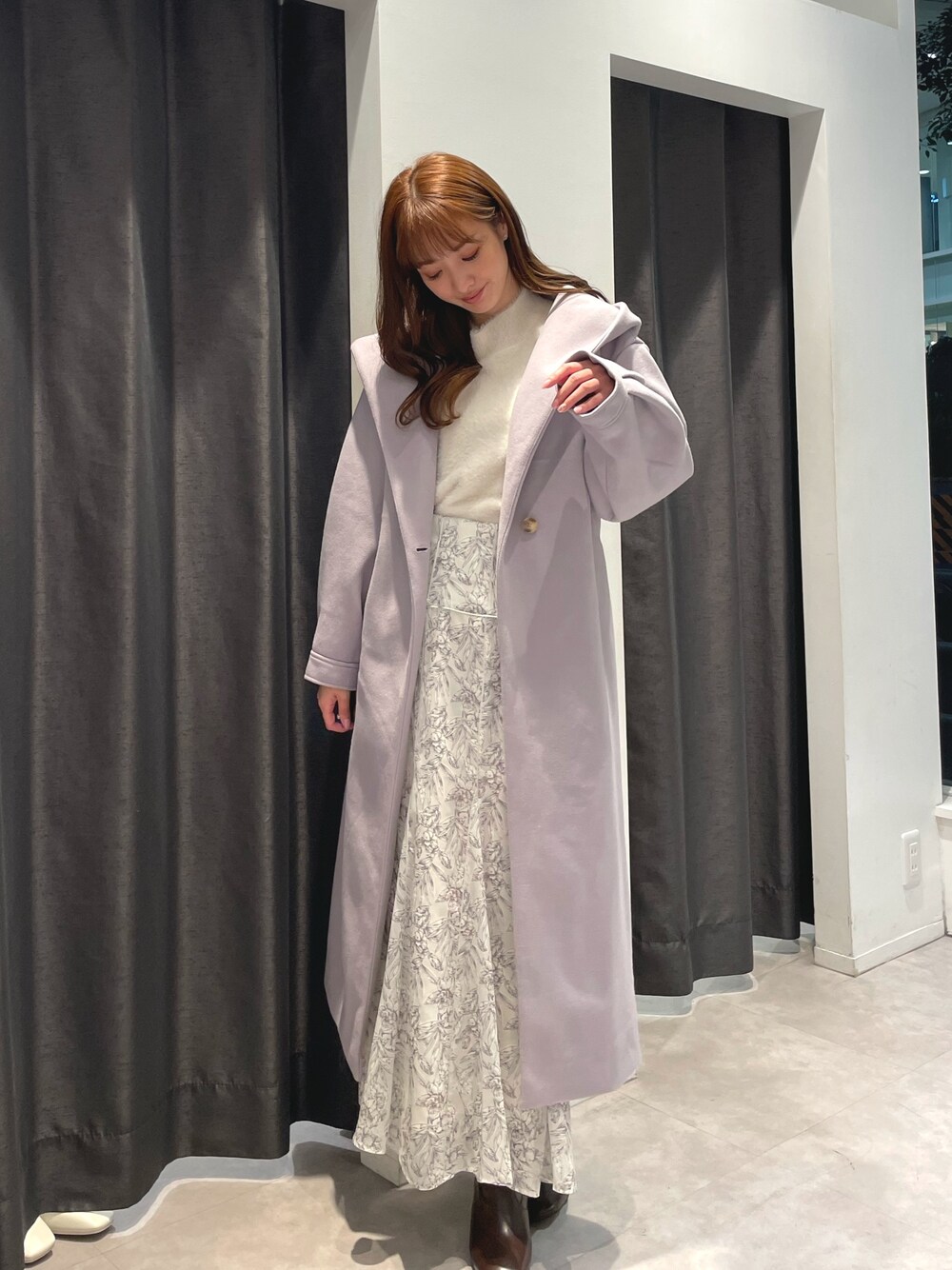 中のトップスとスカートをワントーンにして、ラベンダーカラーが可愛いコートを主役にした、大人フェミニンなデートコーデ👫💕