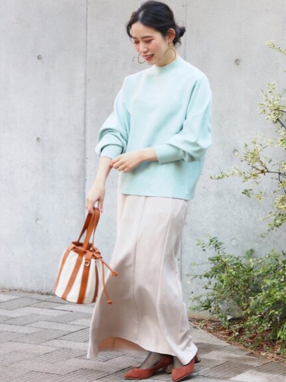 明るいブルーをベージュで合わせた、春カラーコーデ💐ロングスカートも、マーメイドシルエットだと今っぽいしスッキリ履けるから好き☺️