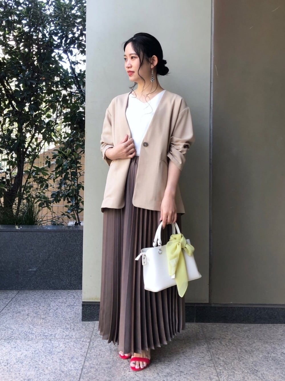 サラッとした質感が、肌心地の良いジャケットを、キレイめにプリーツスカートでスタイリングしたコーデ。ジャケットはゆったりめのデザインなので、トップスはインしてウエストの位置を高く持ってくる事でバランス感のあるONコーデにも◎