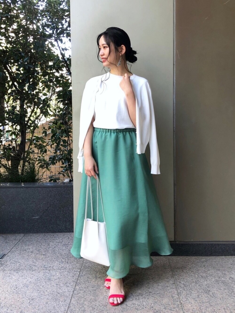 シアースカートを、アンサンブルで上品コーデに🌷 フレアシルエットのスカートなので、トップスはインしてコンパクトにまとめると、低身長でもバランス良くなります😌