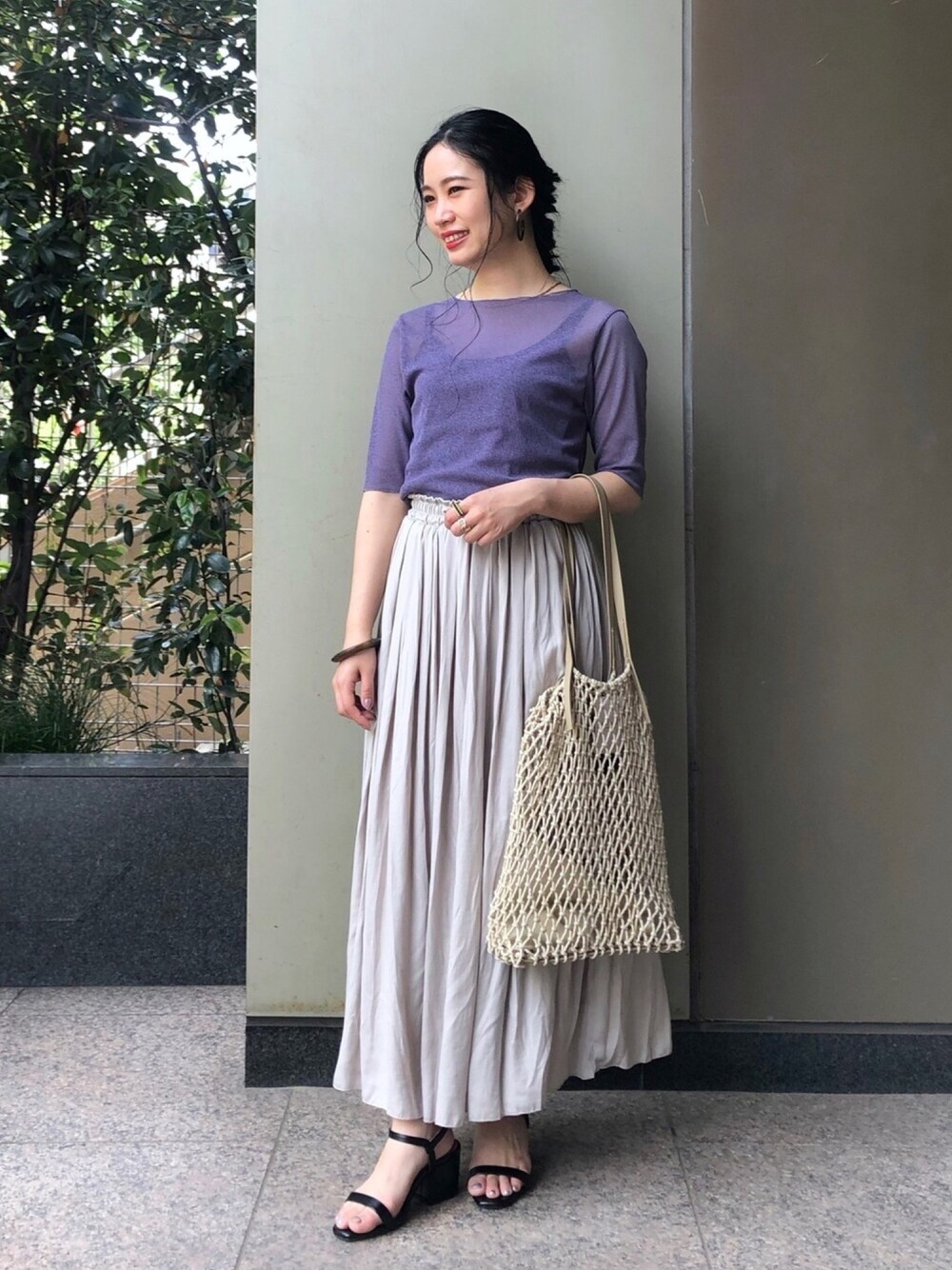 シアートップスでトレンド感のあるキレイめカジュアルコーデ🙆♀️ スカートもお家で洗濯できるので今時期に嬉しいアイテム💜