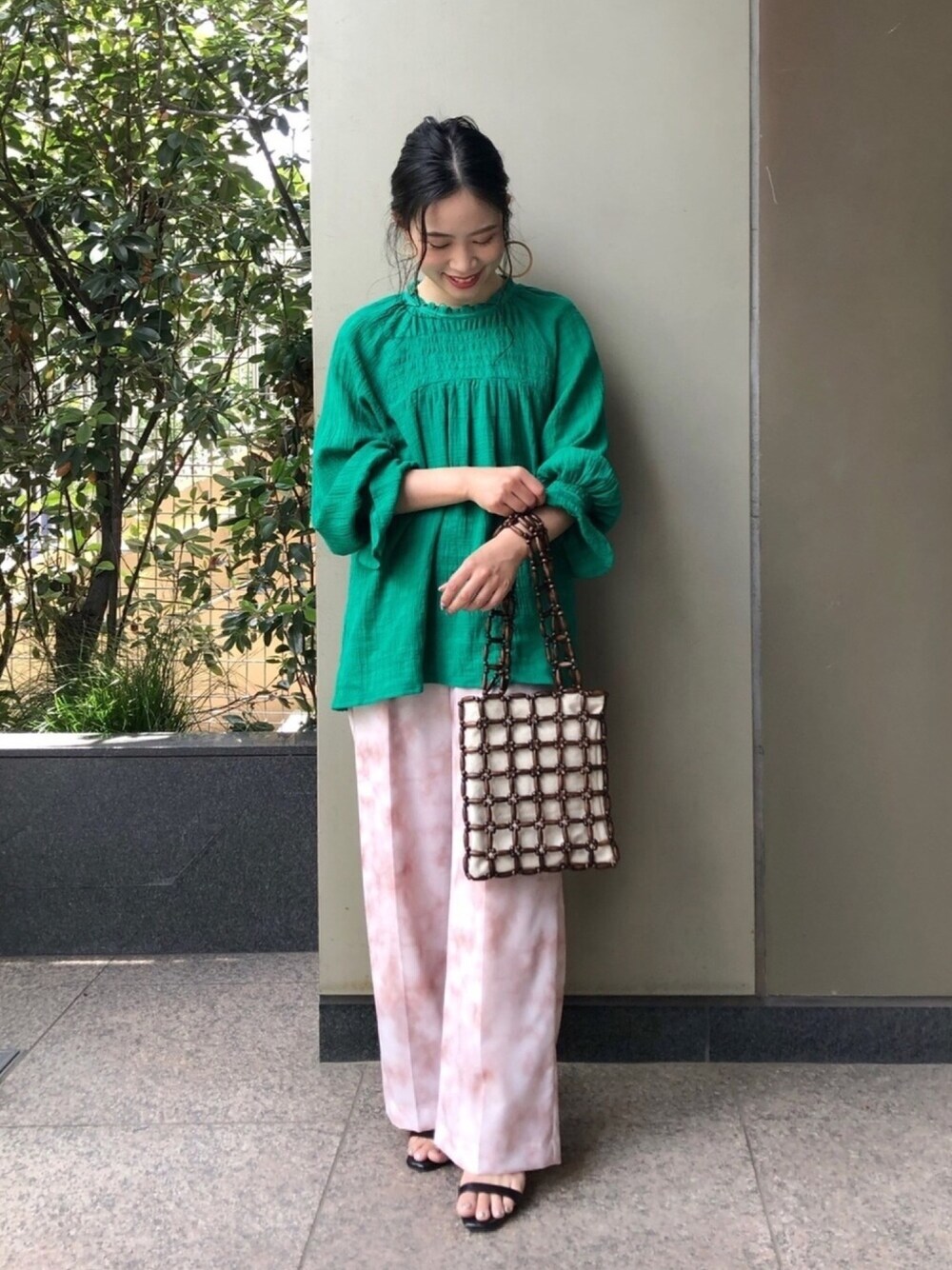 ちょっと肌寒い気温の時は、薄手の長袖ブラウス。楊柳の素材感なので、さらさらした肌触りが気持ちいいです☺️タイダイのパンツと合わせて、今っぽい雰囲気に🌟 そして雨に濡れてもバレない😂✨笑