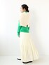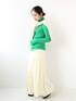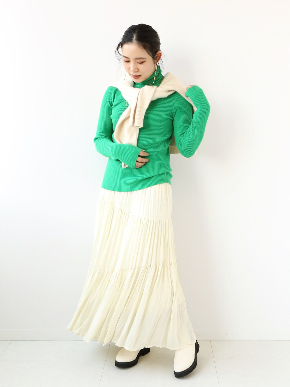 華やかなビビットグリーンをポイントに、他のアイテムをホワイトでまとめた2トーンコーデ。テイストを問わず、秋冬の着回しアイテムになってくれるシンプルなタートルネックは、色違いで欲しくなってしまいます。首元はくしゅっと感がキレイに出る長さと、袖も手の甲にかかる長さがあるのが可愛いです。細身のリブニットでフィット感があるので、ざっくりニットにレイヤードしてカラーを見せるのもオススメです・・♩