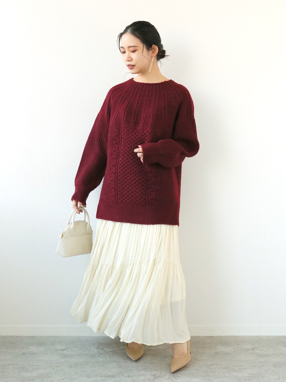 ホワイト×ボルドーで、クリスマスシーズンにもオススメな暖かみのある冬コーデにしてみました。 赤だとポップすぎるけど、落ち着いたボルドーなら雰囲気を作りつつも大人っぽい印象に。 求心デザインのニットなら、シンプルなワンツーコーデにもポイントを作ってくれるので、そのまま合わせるだけでok◎落ち感のあるスカートとも、素材感の違いでバランスを取れて相性抜群です・・♩