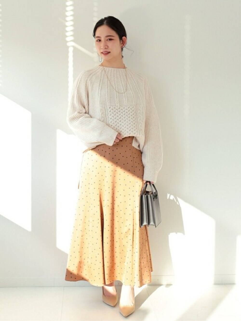 季節感満点の求心デザインが目をひくニット。 ほっこりするケーブル編みは、それだけで冬らしい装いに。ナチュラルは、肌なじみの良い淡いベージュのような色味。顔まわりの印象を明るくしてくれるので、ダークトーンのアウターなどにも相性が良いカラーです。ヒップが隠れる丈感があるので、艶感のあるしなやかな素材のスカートと合わせて、素材感でバランスを◎