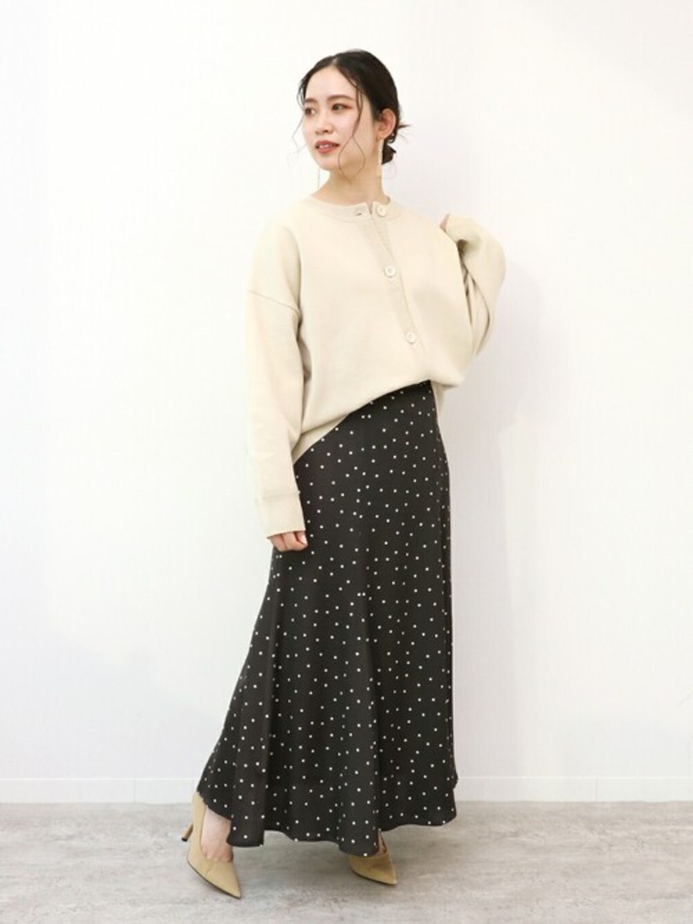 人気のニットカーデに新色が登場! ベーシックに使いやすい、ナチュラルカラー。 生成りのような肌なじみの良い色味で、秋から春までロングシーズン着まわせるのも嬉しいポイント◎ 定番アイテムとして使いやすい色味なので、コーデ合わせに汎用性高く着まわせそうです♩ 今回は、キレイめなドットのスカートと合わせて、レディな雰囲気にしてみました◎ 目の詰まったニット素材で、キレイ見えにも着こなせるのでお仕事にも普段にもオススメのアイテムです。 【クルーネックダンボールカーディガン】 ----- 着心地 ----- チクチク感が気になりにくいニットで、着心地の良い素材感です。 軽い素材感なので、エアリーな着心地。目が詰まっているので、毛玉が出来てもケアしやすそうなところも◎ ----- サイズ感 ----- 身回りはゆったり余裕のあるサイズですが、丈が長すぎないので程よい立体感を楽しめるサイズ感です。 【ハンマードットフレアスカート】 ----- 着心地 ----- 繊細なシボのある素材感で、落ち感のキレイな生地です。軽い着心地で動きやすく、ウエストの後ろが半分ゴムなので、程よくフィットしてくれます。裏地が付いているので、透け感もなく安心して着られました。 ----- サイズ感 ----- 私の身長でも長すぎず、着やすいサイズ感でした。ウエストがスッキリ、裾に向かう程フレアなデザインになっているので、Aラインとマーメードシルエットの間くらいの程よいシルエットでした。 *** 着用スタッフ情報 *** 身長:153cm 体型:普通 肌:ブルべ/冬 骨格:ウェーブ 普段サイズ:S~M(36~38) 着用サイズ:全てフリー