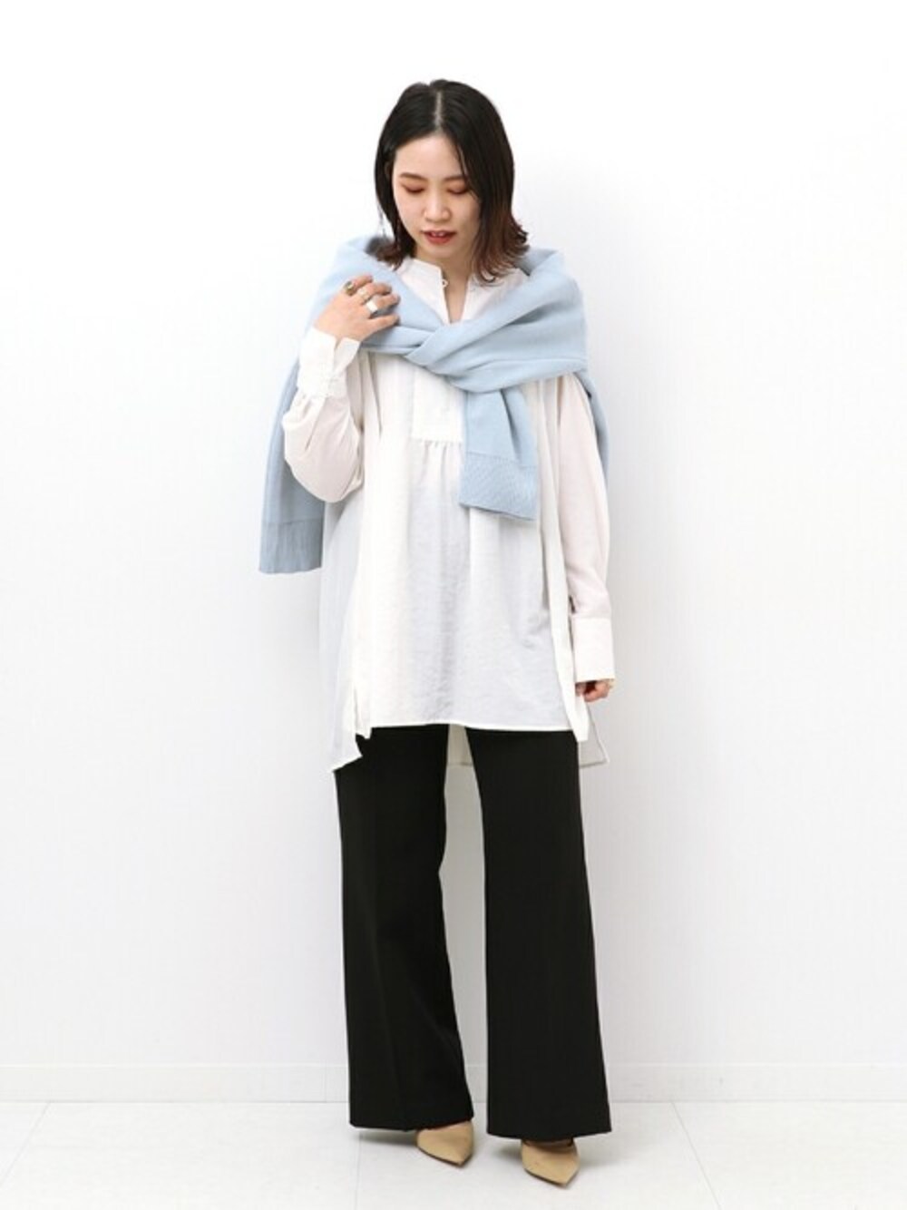 人気のブラウスが追加生産! 春にも着られる薄手のブラウス。 冬はアウターの中に、春は一枚で・・ 着まわし力抜群のシンプルなデザインは、風に揺れるしなやかな素材感。バックプリーツのデザインになっているので、後ろ姿も抜かりなく◎ 襟元はボタンになっているので、そのままでは勿論、少し開けてVラインを作るのも顔まわりの印象がスッキリするので、雰囲気を変えたい時にもオススメです。 【バックプリーツブラウス】 ----- 着心地 ----- 軽い着心地、スルッと肌触りの良い素材感です。グレーは、若干透け感があるのでインナーを気を付ければエアリーな雰囲気がキレイに出ます◎ ----- サイズ感 ----- ゆとりをもって着られるサイズ感ですが、シルエットが大きく見えない絶妙なデザインです。 *** 着用スタッフ情報 *** 身長:153cm 体型:普通 肌:ブルべ/冬 骨格:ウェーブ 普段サイズ:S~M(36~38) 着用サイズ:全て/フリーサイズ