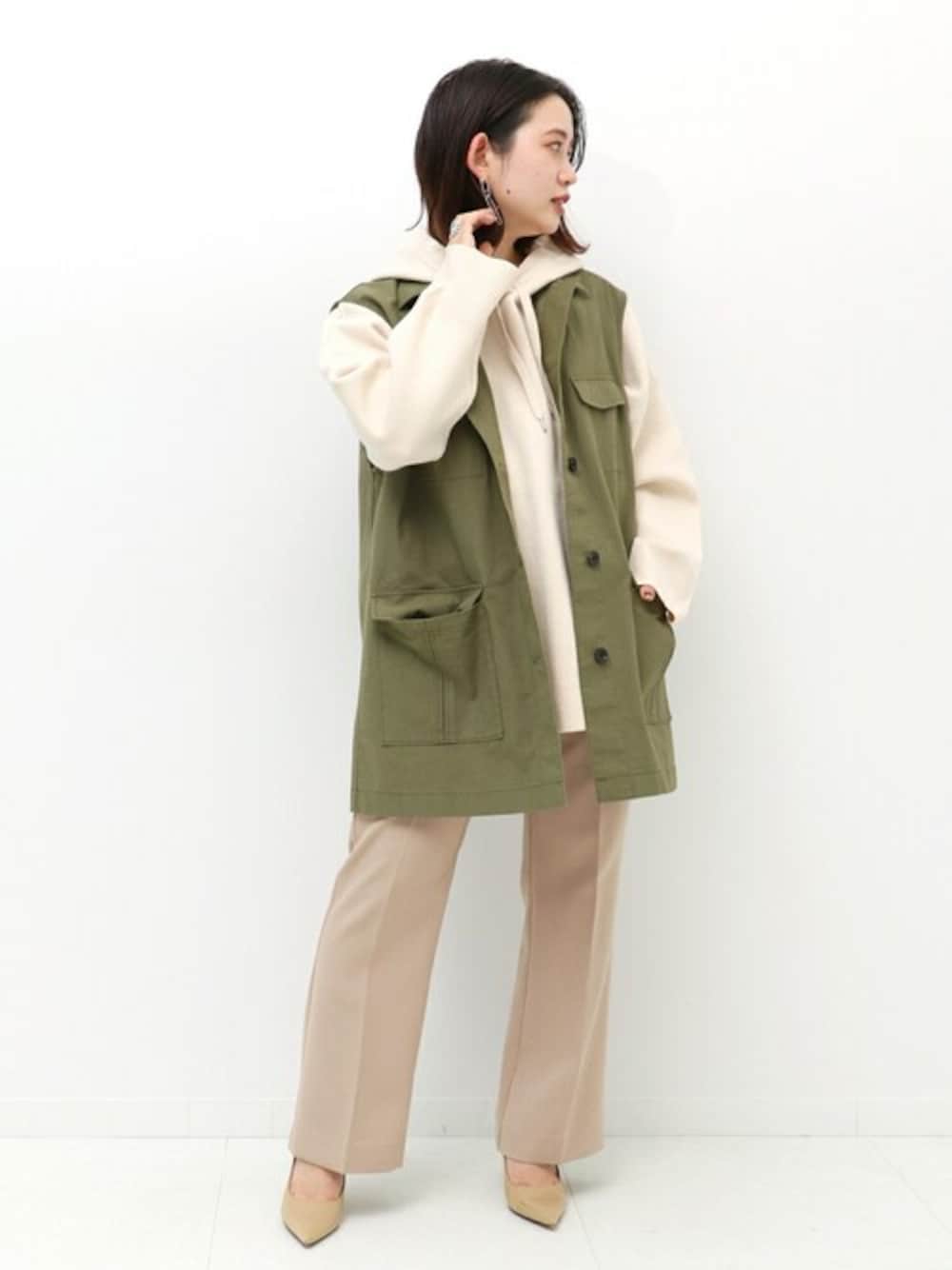 上半身、重めのバランス。 ミリタリーテイストのベストは、長めの丈感でラフに着こなせるアイテム。ニットのパーカーと合わせて、カジュアルに合わせてみました。ビッグシルエット同士のトップス合わせも、下半身をスッキリさせるバランスで合わせれば、低身長でもメリハリよくまとまります◎今回は、センタープレスの入ったパンツで合わせて、足元はヒールにして、よりボリューム感をなくしてみました。 【ニットWフェイスパーカー】 ----- 着心地 ----- ゆるっと余裕があるので、中にタートルネックなどをインしてもボリュームを拾わず、レイヤードコーデにも◎程よくハリのあるしっかりした素材感で、チクチクしにくく、着心地が良かったです◎ ----- サイズ感 ----- 余裕を持って着られるサイズ感で、身幅もあり、着丈もヒップを覆う丈感がありました。上半身に重心を置いたバランスコーデがしやすいサイズ感だと思います! 【セットアップ センタープレスパンツ】 ----- 着心地 ----- なめらかな素材感で、着心地の良い生地。 サラッとしているので肌心地が良いです。 オールシーズン着まわしの出来る素材感なので、何かと重宝しそうです。 ----- サイズ感 ----- 低身長なので、やや長めの丈感でしたが、ヒールと合わせると程よく履けました。丈直ししてもデザインが崩れすぎないので、私の身長ではお直しもアリです◎ウエストが後ろゴムになっているので、窮屈感なく、ゆるすぎず、程よく履けるサイズ感でした。 【ミリタリーベスト】 ----- 着心地 ----- やや張り感のある素材感で、軽くて着心地が良かったです。 春夏はカットソー、秋冬はニットを下に着るなどして、オールシーズン着まわせそうです◎ ----- サイズ感 ----- 私の身長で、太腿丈。オーバーサイズで今っぽく着られる、ゆとりのあるサイズ感です。袖口にも余裕があるので、袖コンシャスなデザインのトップスを中に着ても、もたつきにくいのが良かったです◎ *** 着用スタッフ情報 *** 身長:153cm 体型:普通 肌:ブルべ/冬 骨格:ウェーブ 普段サイズ:S~M(36~38) 着用サイズ:全て/フリーサイズ