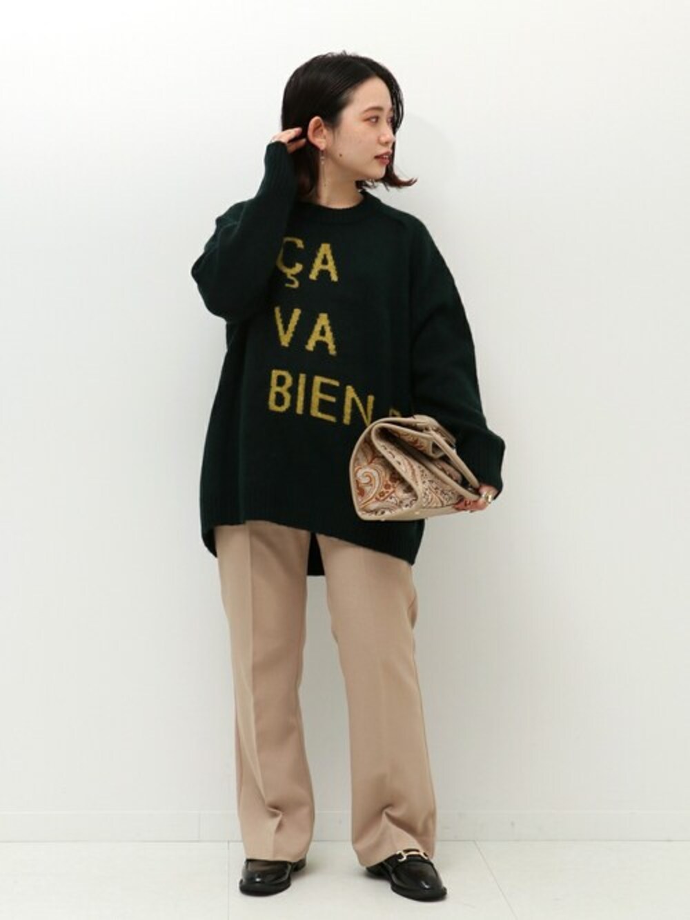 今年の冬、特にオススメのロゴニット。 肌触りの良い、インターシャ編みのロゴニットが、追加生産決定!もちもちっとした着心地で、ラフに着こなせる、ゆるっとしたシルエット。ロゴのデザインがコーデのポイントになってくれるので、大人カジュアルな着こなしに◎ ヒップを隠す丈感があるので、さりげない体型カバーにも嬉しい一着。スカートもパンツもバランスを取りやすいので、組み合わせの幅広く、冬のコーデに活躍してくれそうです! 【インターシャロゴクルーネック】 ----- 着心地 ----- 個人差あるかとは思いますが、チクチク感の気にならない着心地でした。もちっと伸びる肌心地の良い素材感が、つい着たくなってしまう着心地でした。 ----- サイズ感 ----- 大きめサイズでゆるっと着られるのが可愛いです。ゆとりがあるのでレイヤードしても良いですし、一枚でも◎ヒップを隠す丈感があるので、体型カバーにも◎ 【セットアップ センタープレスパンツ】 ----- 着心地 ----- なめらかな素材感で、着心地の良い生地。 サラッとしているので肌心地が良いです。 オールシーズン着まわしの出来る素材感なので、何かと重宝しそうです。 ----- サイズ感 ----- 低身長なので、やや長めの丈感でしたが、ヒールと合わせると程よく履けました。丈直ししてもデザインが崩れすぎないので、私の身長ではお直しもアリです◎ウエストが後ろゴムになっているので、窮屈感なく、ゆるすぎず、程よく履けるサイズ感でした。 *** 着用スタッフ情報 *** 身長:153cm 体型:普通 肌:ブルべ/冬 骨格:ウェーブ 普段サイズ:S~M(36~38) 着用サイズ:全て/フリーサイズ