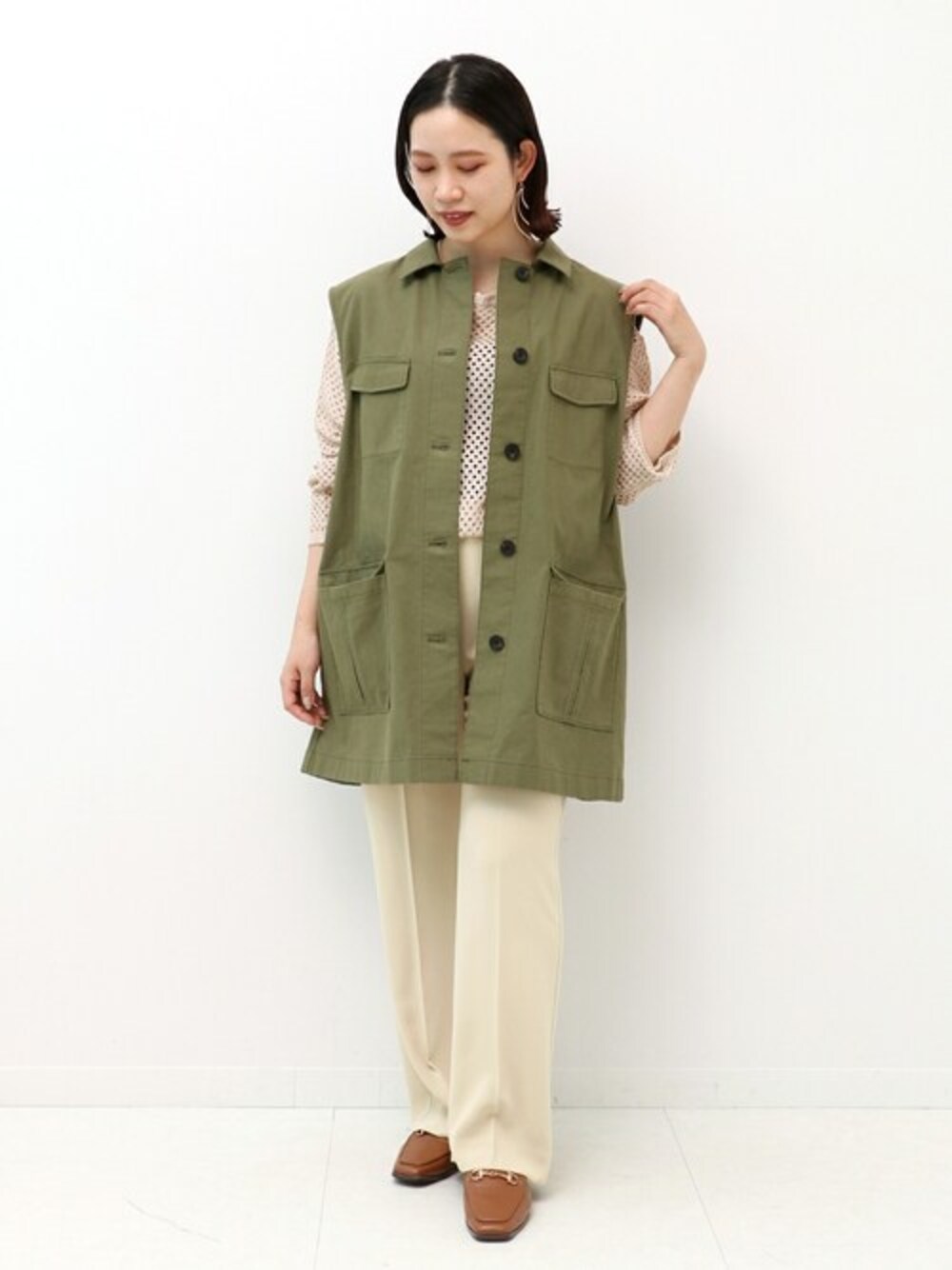 春仕様のアースカラー ミリタリーベストは、大きめなデザインが何とも可愛い一着。ニットもカットソーもブラウスも、合わせやすさ抜群。季節によって中に着るものを変えてオールシーズン着られるアイテムになってくれそうです。今回は、肌なじみの良い明るめのベージュに合わせて、ベストが主役になるコーデにしてみました。低身長な私はトップスをインしてウエスト位置を高く見せる事で、中物がワントーンでもメリハリのあるバランスを意識してみました◎ 【メッシュニットPO】 ----- 着心地 ----- 柔らかいメッシュニットで、シワが気になりにくい素材感なので、ご旅行のお供にも。ヘルシーにキャミやタンクトップで合わせるのも、ロンTなどで透け感を楽しむのも◎ ----- サイズ感 ----- ゆとりのあるサイズ感ながらも、ボリュームの出にくい柔らかな素材感なので大きく見えないサイズ感です。腰を隠す丈感があるので、さりげない体型カバーにも◎ 【ミリタリーベスト】 ----- 着心地 ----- やや張り感のある素材感で、軽くて着心地が良かったです。 春夏はカットソー、秋冬はニットを下に着るなどして、オールシーズン着まわせそうです◎ ----- サイズ感 ----- 私の身長で、太腿丈。オーバーサイズで今っぽく着られる、ゆとりのあるサイズ感です。袖口にも余裕があるので、袖コンシャスなデザインのトップスを中に着ても、もたつきにくいのが良かったです◎ 【カラーフレアパンツ】 ----- 着心地 ----- スルッとした素材感で、オールシーズン着られる素材感。裏地なしですが、透けないので定番のベースアイテムとして重宝しそうです。ウエストも全周ゴム&内側を紐で結べるので、様々な体型の方にフィットしやすい一着です。 ----- サイズ感 ----- 私の身長でフラットシューズでも床を擦らずに履けて、ちょうど良い丈感でした!低身長でなかなか丈の合うパンツがなかったので、このサイズ感は嬉しいです。裾はややフレアという感じなので、トレンド感が強すぎずに、脚をキレイに見せてくれるようなデザインでした。 *** 着用スタッフ情報 *** 身長:153cm 体型:普通 肌:ブルべ/冬 骨格:ウェーブ 普段サイズ:S~M(36~38) 着用サイズ:全て/フリーサイズ